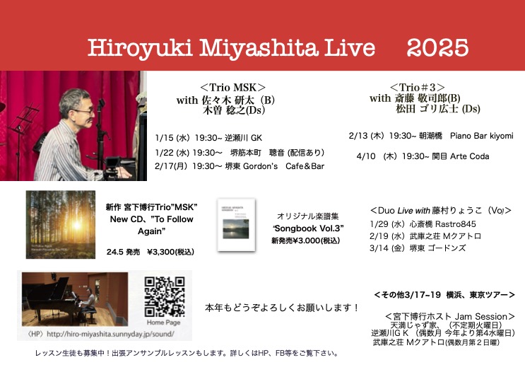 関西では2つのトリオでのライブも定期的に行い、Tokyo Trioも復活、関東へも演奏に行く事も出来たのはよかったです。