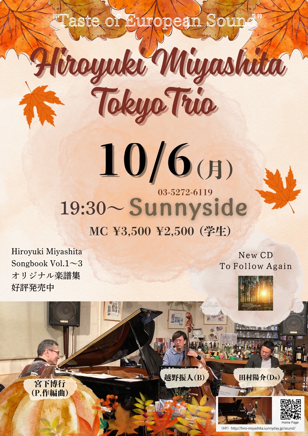 宮下博行 LIVE SCHEDULE カレンダー リスト « イベント一覧 このイベントは終了しました。 10/6(月)19:30~関東ツアー 高田馬場 Sunnyside:” Tokyo Trio” 宮下博行(P,作編曲)、田村陽介(Ds)、越野振人(B) 2025年10月6日日♪7:30 PM - 10:30 PM « 10/5(月)19:00~ 関東ツアー 川越 音喫茶一乗:” Tokyo Trio” 宮下博行(P,作編曲)、田村陽介(Ds)、越野振人(B) 10/7(火)Pm7:30〜<関東ツアー> 横浜関内ベンテヌート(Vo) with 宮下(P) » 今回の関東ツアー、”東京Trio”今回も2Days. 2日目はお馴染みのココ! MC ¥3500 学生¥2,500 B.若手実力派、越野振人くんとのトリオも好評! 楽しみです。 皆様のお越しお待ちしています。 10/6(月)19:30~関東ツアー 高田馬場 Sunnyside:” Tokyo Trio” 宮下博行(P,作編曲)、田村陽介(Ds)、越野振人(B) カレンダーに追加 Google カレンダー iCalendar Outlook 365 Outlook Live 詳細 日付: 2025年10月6日 時間: 7:30 PM - 10:30 PM イベントカテゴリー: 1.おすすめ!H.Mリーダーライブ イベント タグ: Sunnyside, Tokyo Trio, 宮下博行, 田村陽介, 高田馬場 会場 Sunnyside 新宿区西早稲田3-28-1 理工社ビル2F 東京都, 169-0051 Japan + Google マップ 電話番号 03-5272-6119 会場 のウェブサイトを表示する ライブスケジュールは決まり次第、更新していきます。
