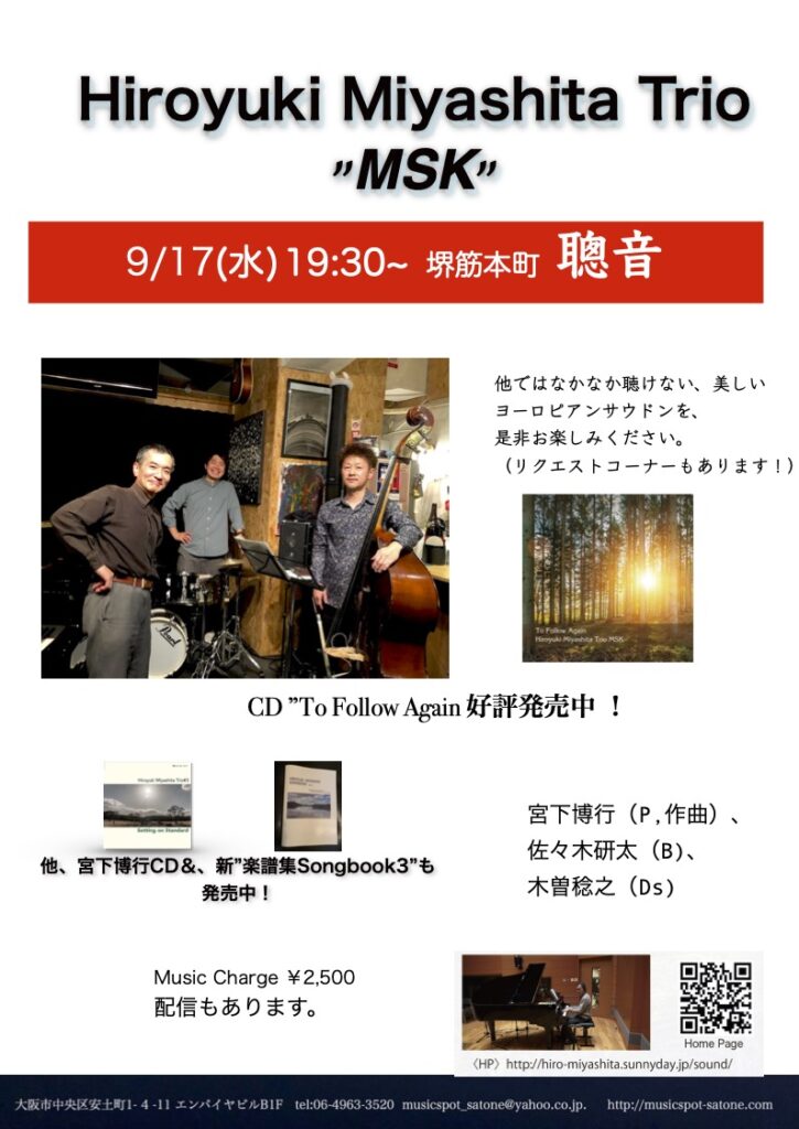 9/17(水)19:30~ 堺筋本町 聰音(Satone) 宮下博行Trio MSK with 佐々木研太(B)、木曽稔之(Ds)